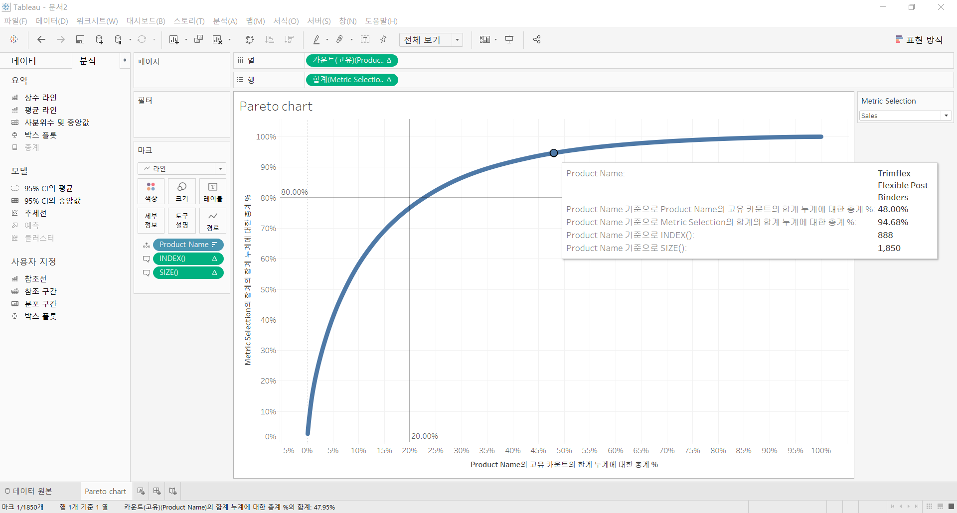 -> 이름 카운트 고유로 압축 -> 행/열 모두 테이블 계산 - 누적, 특정 차원 이름 선택 -> 순서로 나옴