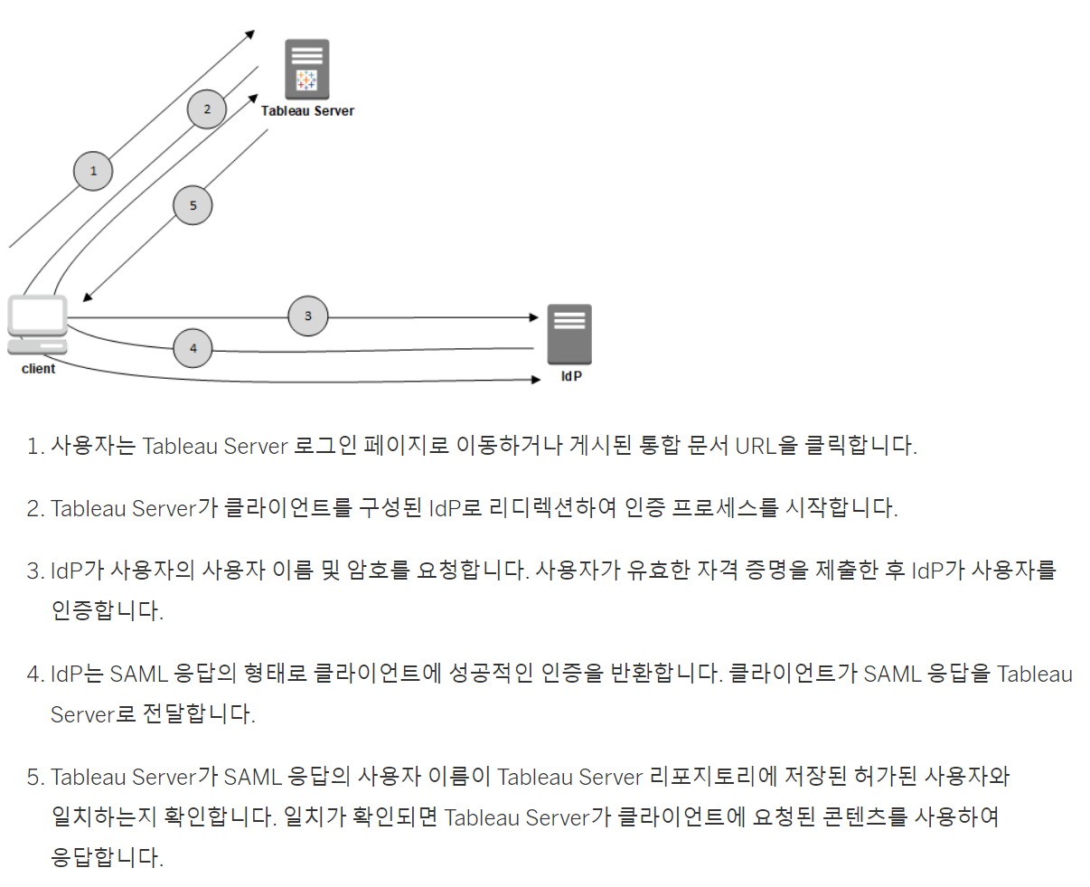 * SAML은 데이터 원본, 통합 문서 등 서버의 콘텐츠에 대한 사용 권한을 적용하지 않음? 통합 문서 및 데이터 원본 연결되는 액세스를 제어하지 않는다??? => 사용자 인증은 Tableau 외부 IdP에서 수행, 사용자 관리는 ID 저장소(AD, LDAP, 로컬 등) 에서 수행