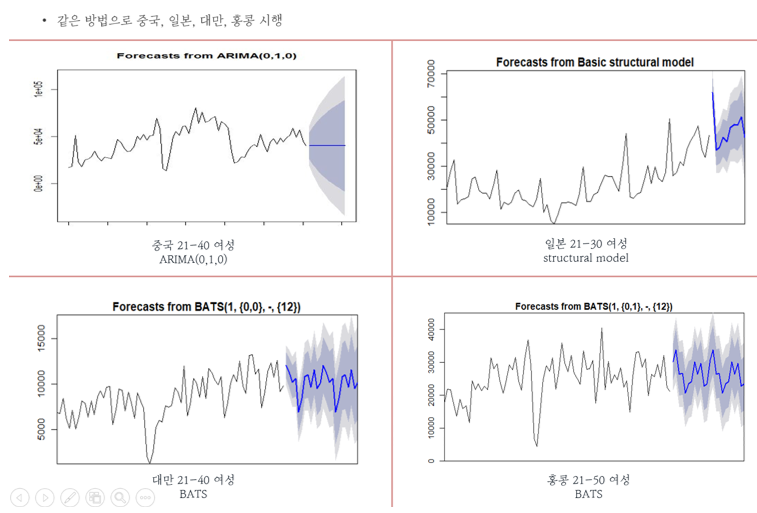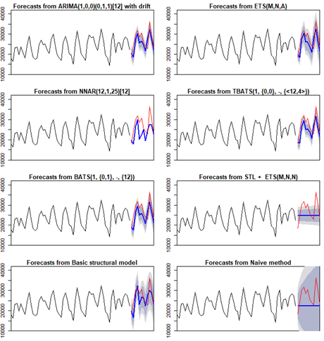 왼쪽 위부터 ARIMA, 지수평활, neural network, TBATS, BATS, 계절조정 후 재계절화 기법, structural, naïve