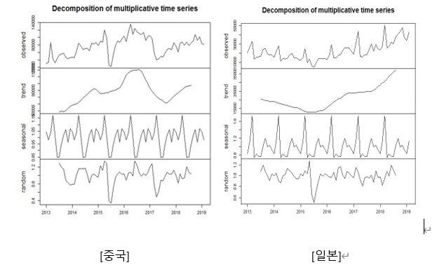 중국은 싸드 문제로 인해 관광객이 2017년 대폭 감소했지만 점차 회복하고 있다. 계절성은 모두 뚜렷한 것으로 보인다.