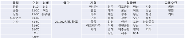 입국항 – 인천공항, 교통수단 – 공항 선택, 성별 - 승무원 제외 (연령 - crew 제외)