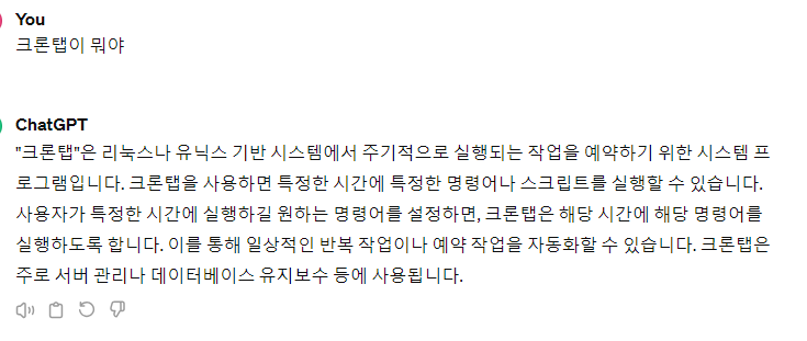 먼저 크론탭이란 리눅스에서 주기적으로 실행되는 작업을 예약하기 위한 시스템 프로그램입니다. 명령어를 직접 입력하거나 작성한 스크립트 파일이 예약한 시간에 실행되도록 걸어두는 건데요.