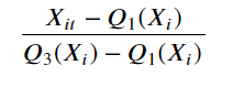 - minmax와 유사하지만 IQR을 사용해 25%, 75%값을 사용해 변환