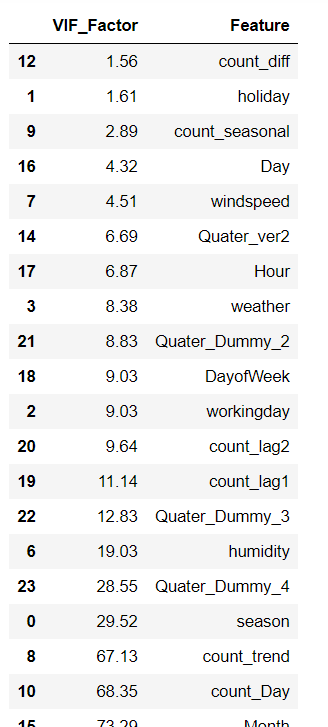 - 독립변수를 다른 독립변수들의 선형회귀로 나타내, 가장 상호의존적인 변수 제거