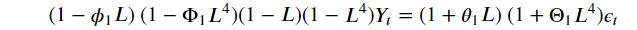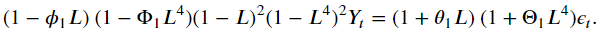 - 𝑌𝑡−(1+𝜙)𝑌(𝑡−1)+𝜙𝑌(𝑡−2)−(1+Φ)𝑌(𝑡−12)+((1+Φ)+𝜙(1+Φ))𝑌(𝑡−13)−𝜙(1+Φ)𝑌(𝑡−14)+Φ𝑌(𝑡−24)−(Φ+𝜙Φ)𝑌(𝑡−25)+𝜙Φ𝑌(𝑡−26) = 𝜖𝑡