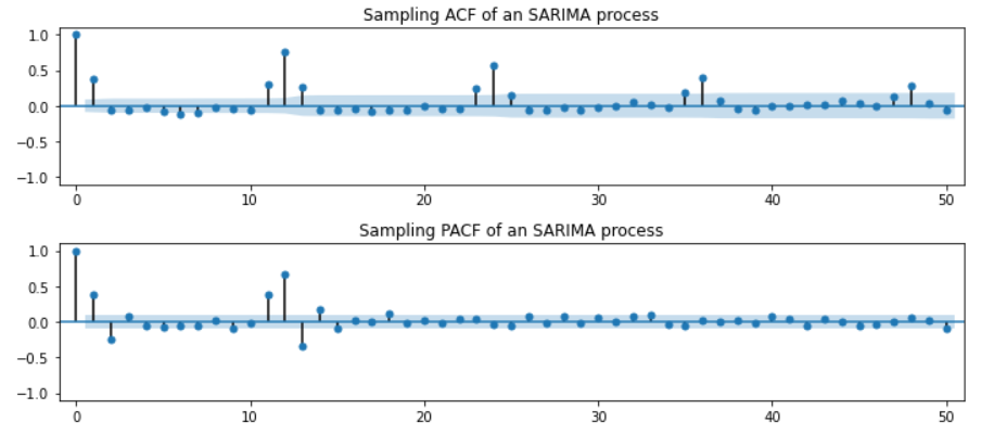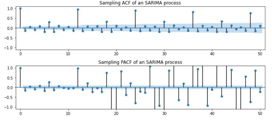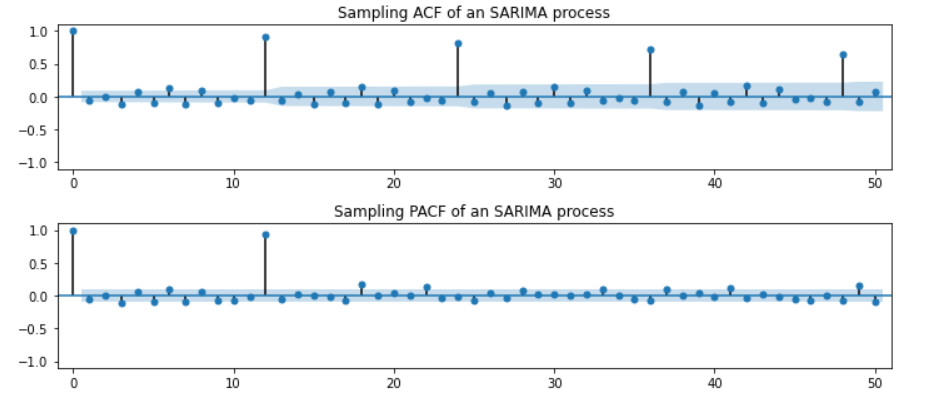 - ACF가 지수적 감소 / PACF가 12마다 유의수준을 벗어난 증가 보임