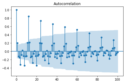 sm.graphics.tsa.plot_acf(candidate_seasonal, lags=100, use_vlines=True)