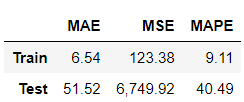 Score_ts_sarimax, Resid_tr_ts_sarimax, Resid_te_ts_sarimax = evaluation_trte(Y_train_feR, pred_tr_ts_sarimax,