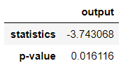 pd.DataFrame([coint_result[0], coint_result[1]], index=['statistics', 'p-value'], columns=['output'])