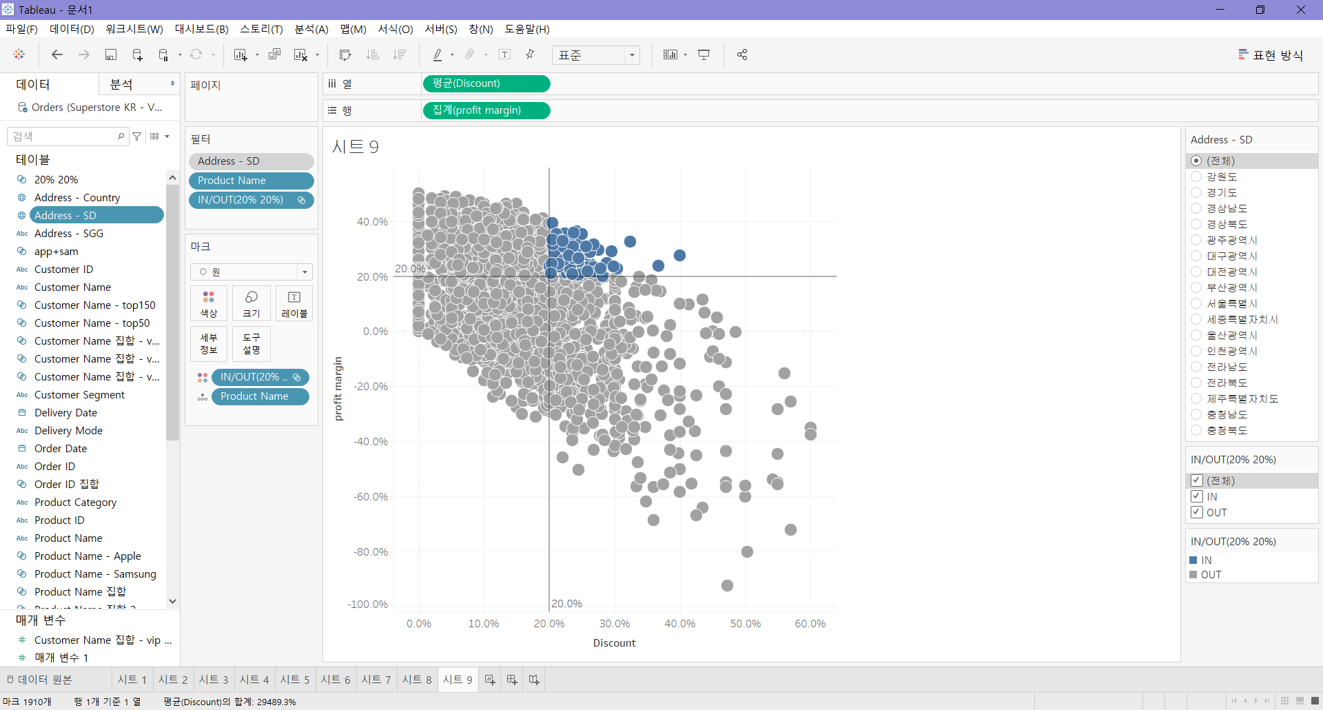 - 집합 조건 수식으로 AVG([Discount])>=0.2 AND [profit margin] >= 0.2 : 색상 마크